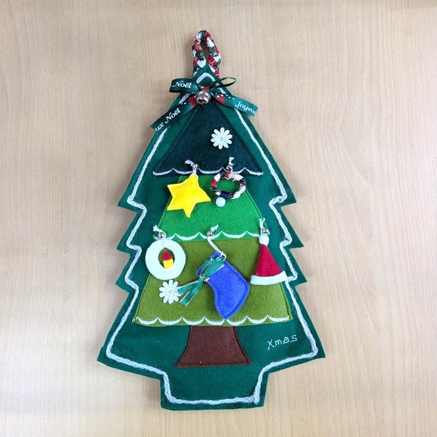温かみと可愛さの演出には欠かせないフェルト素材で丁寧に仕上げました。5つのオーナメントは取り外しができ、変化を楽しめます。フックかけのひもはクリスマスプリント3色で三つ編みにしています。最新作はツリーを3段構造に変え、今までよりもより立体感を出しています。フェルトを使用しているのでとても軽く、どこにでも飾りやすく、かわいらしいインパクトのあるデザインが特徴です。色使いには心弾む可愛らしさに重点をおいて作っています。また、今年は毛糸ラインと刺繍を加えることで新たなオリジナル性をプラスした手づくりツリーです。このアイテムはクリスマスの雰囲気を存分に楽しむことができ、あなたのお部屋に彩りを添えてくれることでしょう!