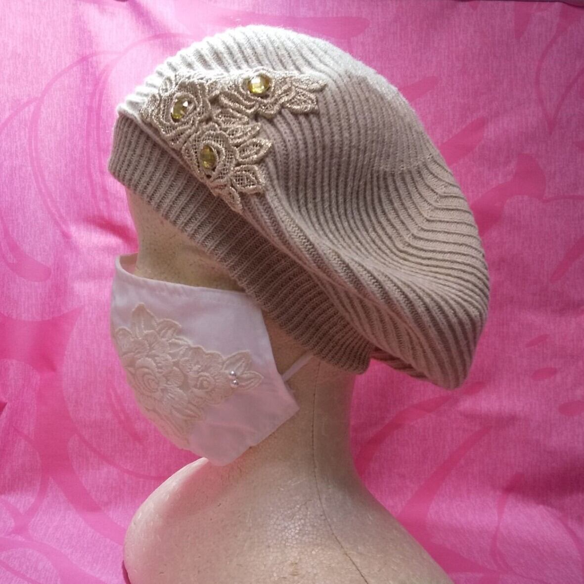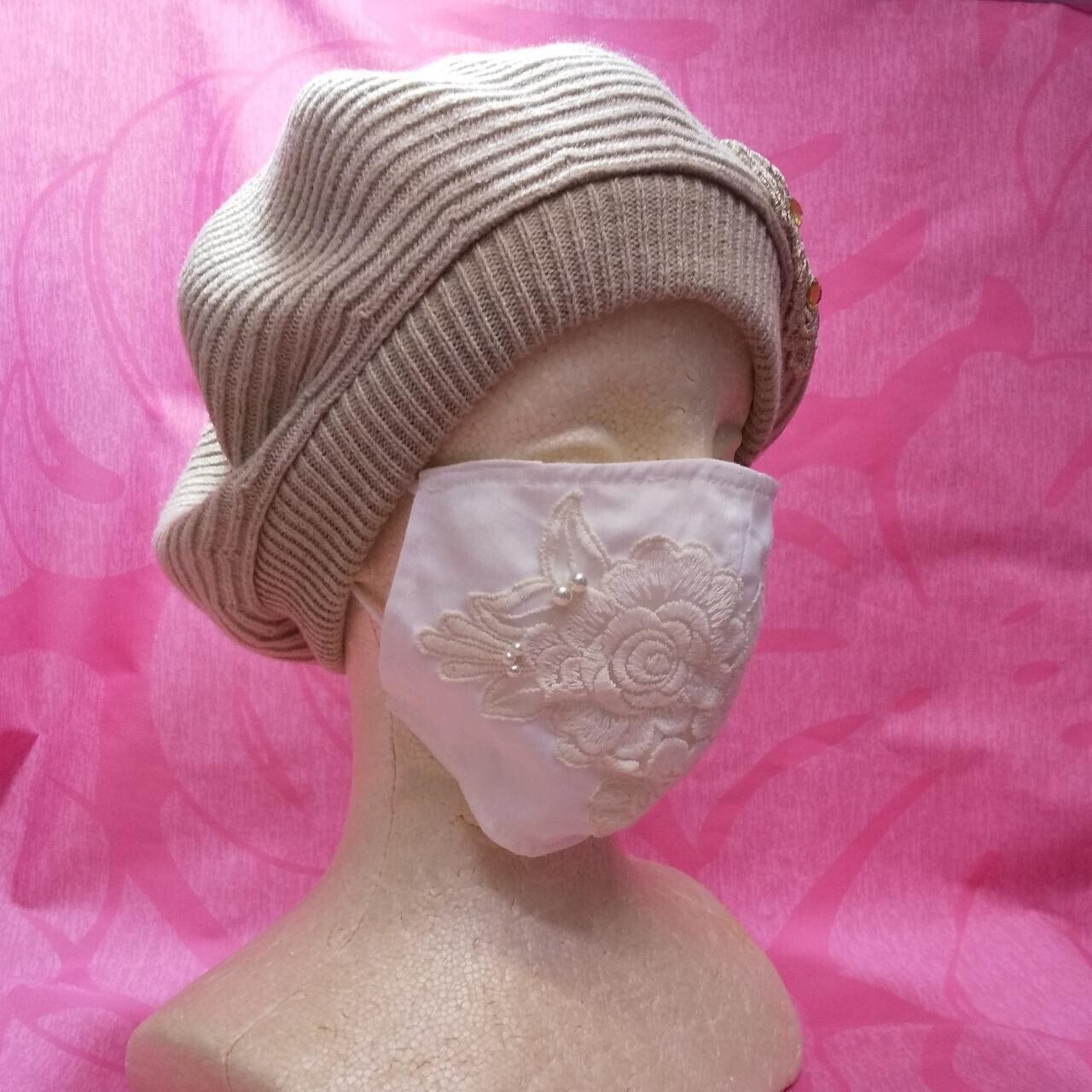 オフホワイトの綿ブロードに生成バラ柄モチーフレースを使った素敵なマスクカバーです。