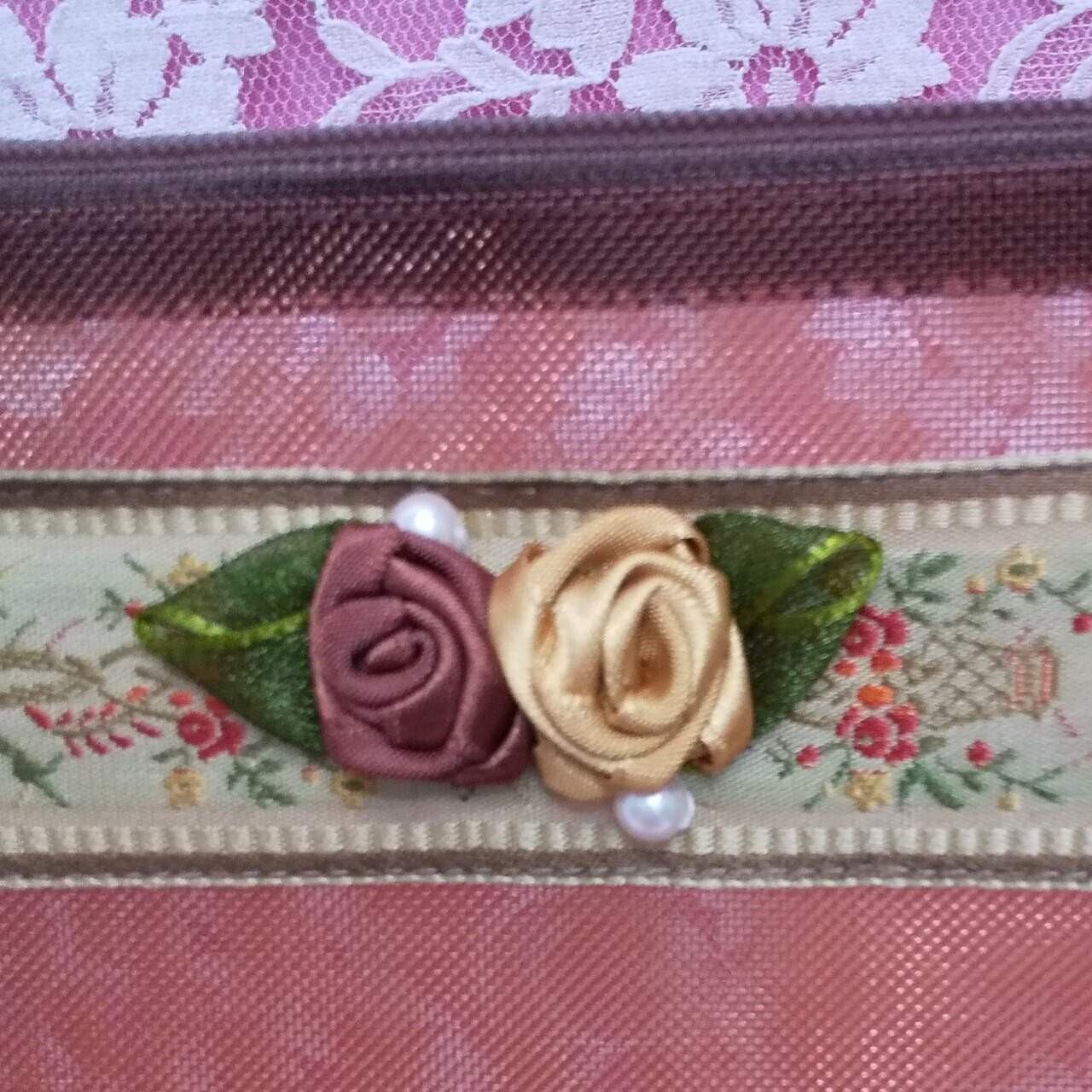 ⁑バラ花&パールとジャガードリボン付きハードチュールポーチ⁑